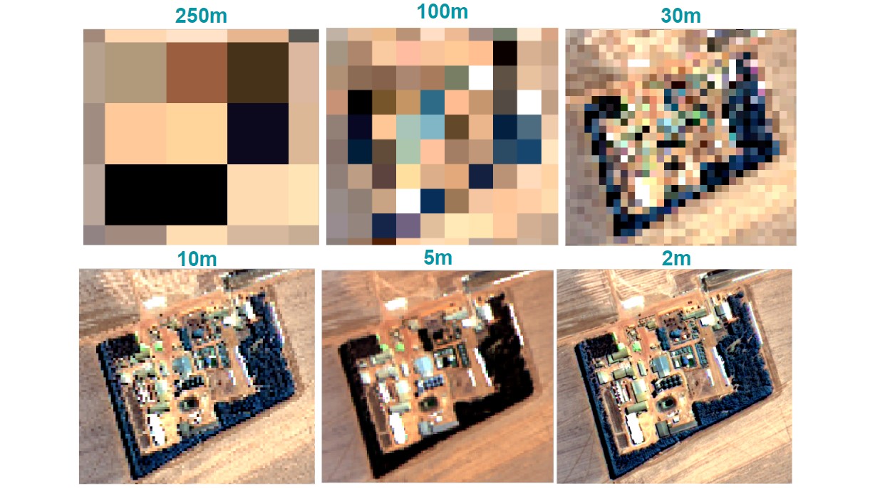 A resolução espacial é normalmente expressa em metros. Por exemplo, uma resolução de 10 metros significa que cada pixel na imagem representa uma área de 10×10 metros na superfície da Terra. Quanto menor o valor, maior a resolução, e portanto, mais detalhes podem ser vistos na imagem.